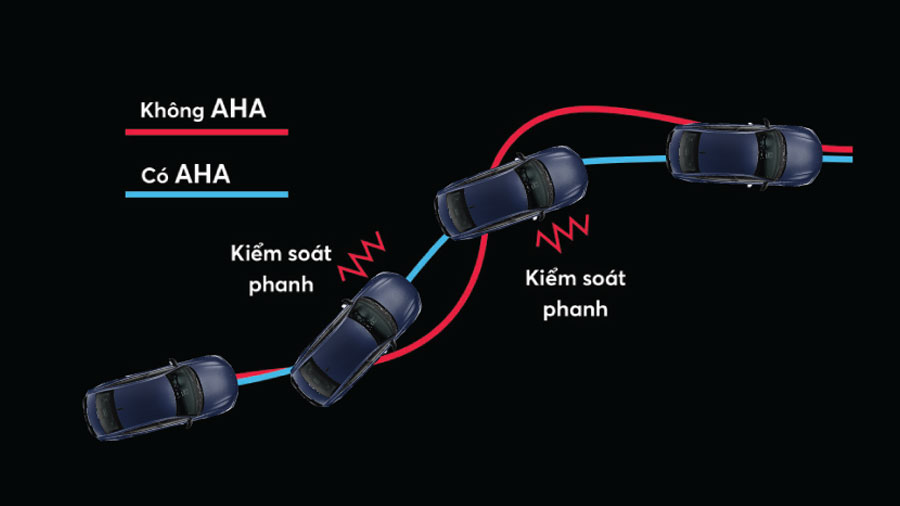 Hệ thống hỗ trợ đánh lái chủ động (AHA) kiểm soát lực phanh trên từng bánh xe tương ứng với gia tốc và mức đánh lái, hỗ trợ người lái bám cua chính xác và tự tin.