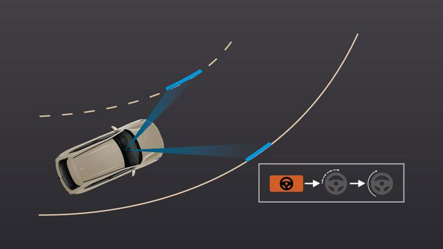 Hỗ Trợ Giữ Làn Đường (LKAS) Hỗ trợ đánh lái để giữ cho xe luôn đi ở giữa làn đường, đồng thời hiển thị cảnh báo trong trường hợp xe đi chệch khỏi làn đường.